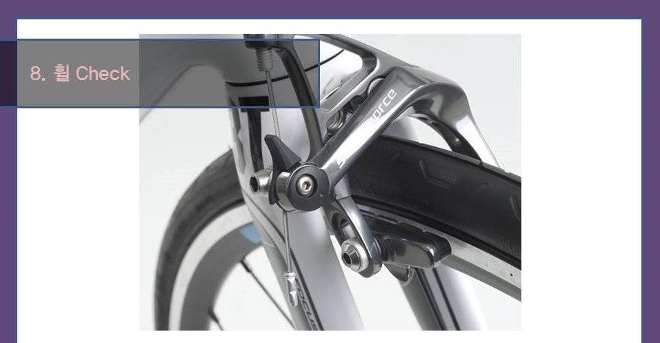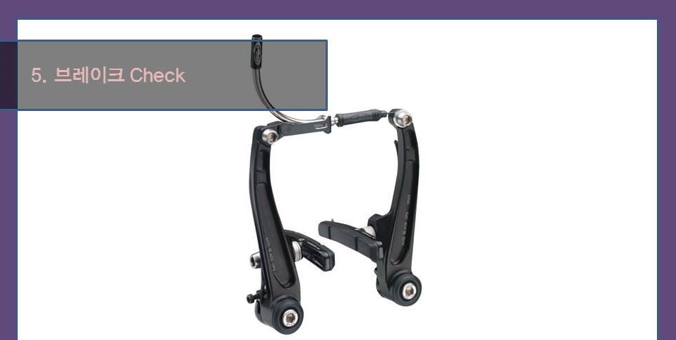 안전과도 직결되는 브레이크는 양쪽이 동일한 힘으로 잡히는지 체크하고 잡았을 때 '끽'소리같은 잡소리가 나지않는지 확인해야한다.