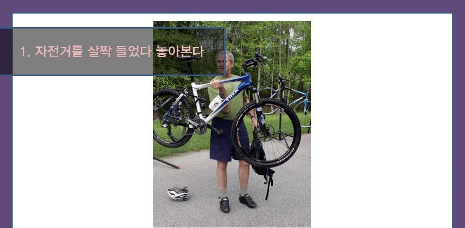 자전거 탑튜브를 잡고 두바퀴를 지면에서 살짝들어 올린 수 바닥에 내려놓아본다.
